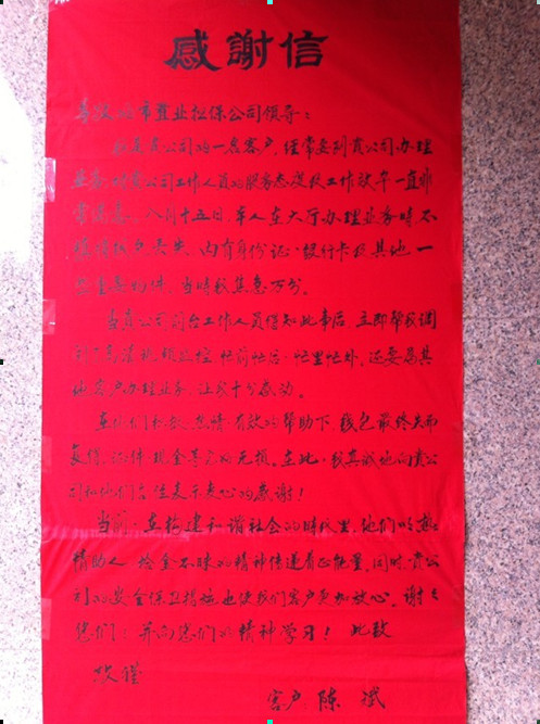 工作人員的熱情細(xì)致的服務(wù)態(tài)度,給陳斌先生及家人留下深刻印象。事后,為了表達(dá)感激之情,陳先生送來(lái)親筆抒寫(xiě)的感謝信,寫(xiě)道:“在構(gòu)建和諧社會(huì)的時(shí)代里,他們以熱情助人,拾金不昧的精神傳遞著正能量!同時(shí),安慶市房屋置業(yè)擔(dān)保公司的安全保衛(wèi)措施也使我們客戶更加放心!”